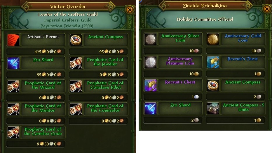 Zro Shard at Holiday Commitee with for 2 Anniversary Silver Coin or 95 Gold. Empire Location: Yasker Tower. League Location: Novogrod. This mean player can acquire item like Wizard Emblem, Study of Perfection, Conclave Edict... just by playing.